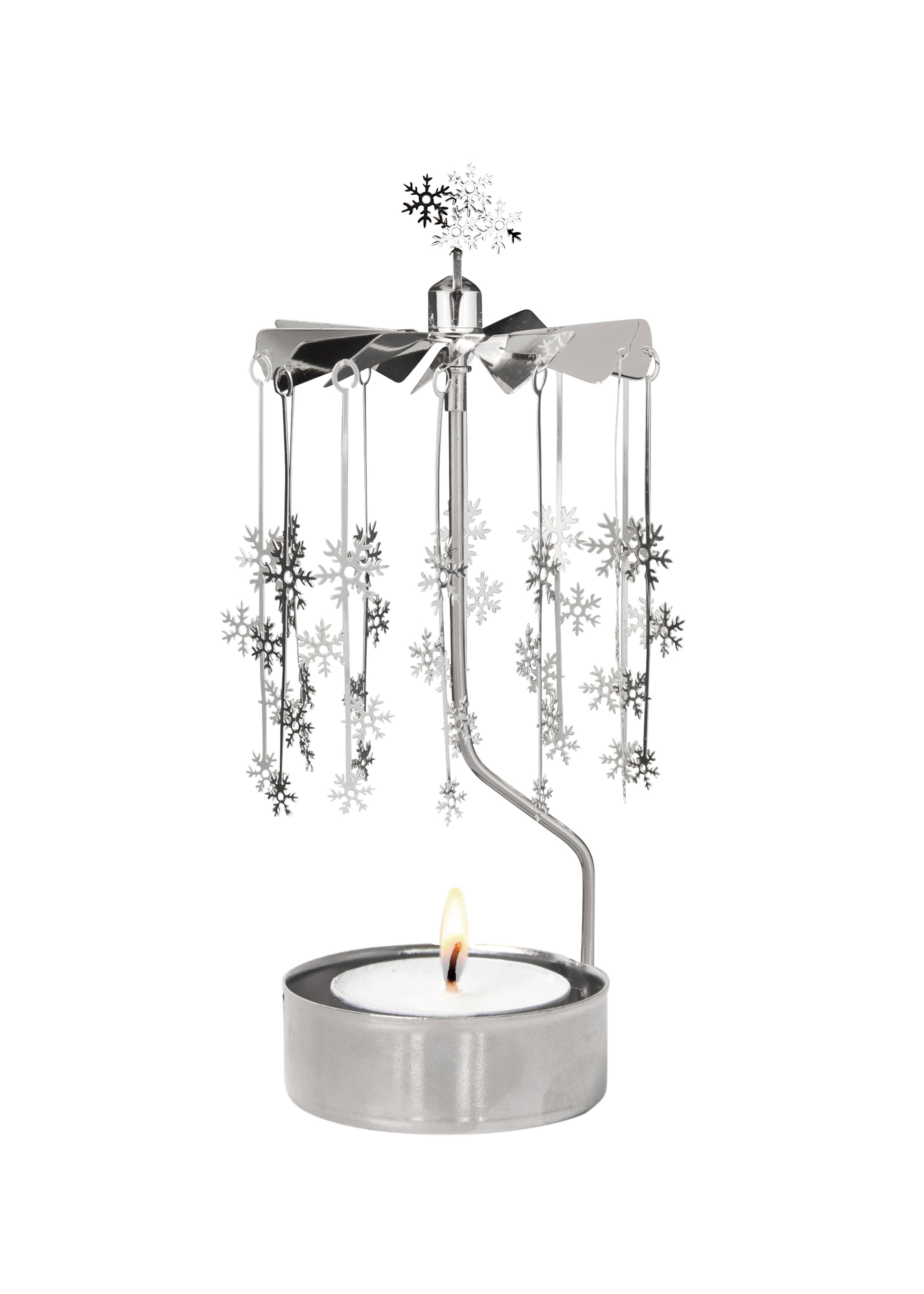 Watch the silver snowflakes dance effortlessly as the warmth of a tealight sets the spinner in motion.